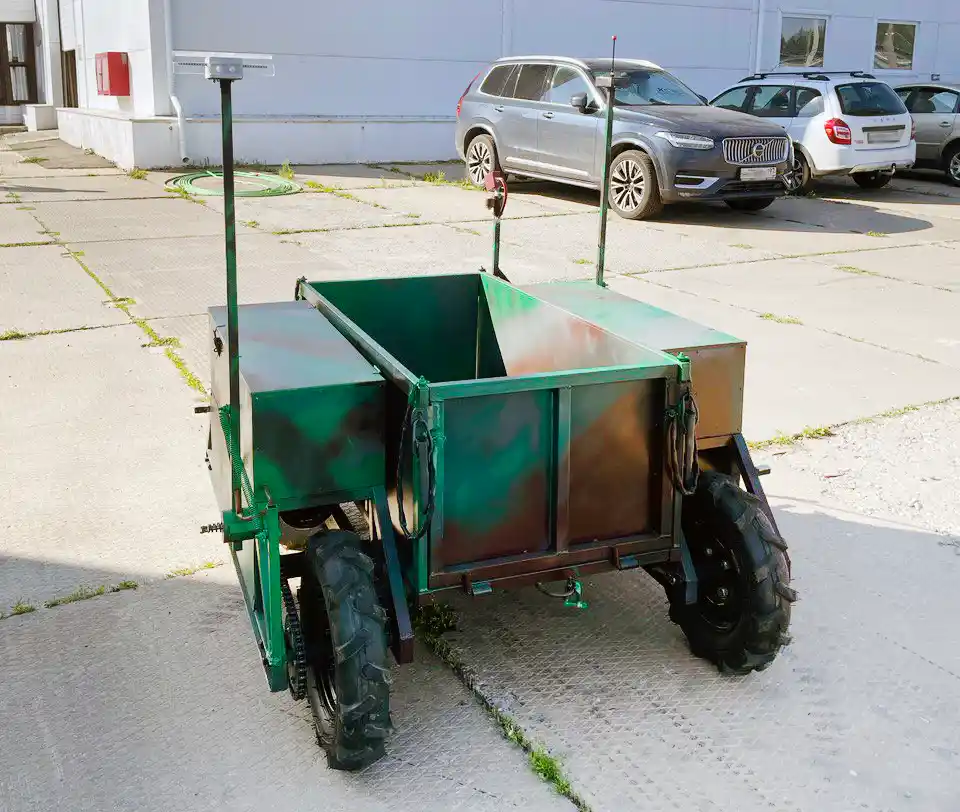 Устройство развивает максимальную скорость до 4 км/ч и способно преодолевать расстояния от 4 до 10 км без подзарядки. Полный привод и специальная конструкция обеспечивают хорошую проходимость, позволяя тележке уверенно передвигаться по пересеченной местности, включая перемещения по траве, грязи и щебню.
